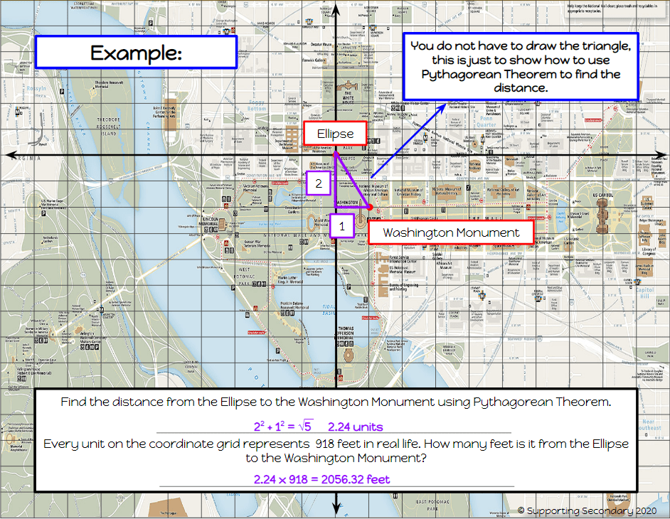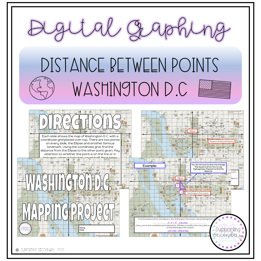 Students will each receive a copy when assigned through Google Classroom. On each of the slides there are two points, the Ellipse at the origin, and another landmark/building that is located in/around The Mall of Washington D.C. Many of the locations are places that the students would visit while on their three day trip including The Lincoln Memorial, The Tomb of the Unknown Soldier, The Vietnam Veterans Memorial, and The Marine Corps Memorial to name a few. There are 30 different locations so there are 30 different slides for the students to solve.